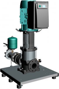 Готовая к подключению установка для водоснабжения с вертикально расположенными, нормальновсасывающими высоконапорными центробежными насосами серий MVIE 70 или 95, со встроенным частотным преобразователем с воздушным охлаждением.