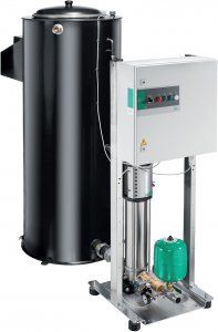 Your advantages Compact system with one Helix FIRST V series stainless steel high-pressure multistage centrifugal pump, in accordance with DIN 1988 and DIN 14462 (redundancy for 2-pump systems) Complete system which is supplied with a round tank (approved for drinking water) connected directly to the suction connection of the pump Hydraulic power within the series of up to 18 m3/h for 100 m delivery head Easily adjustable and operationally reliable due to the FLA operating unit (TÜV tested) Preconfigured bypass flow, for pump protection with low flow