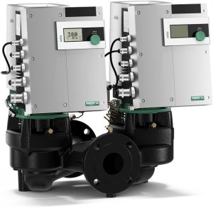 Высокоэффективный сдвоенный линейный насос с электронно-коммутируемым двигателем и электронной мощности с сухим ротором. Исполнение в качестве одноступенчатого низконапорного центробежного насоса с фланцевым подсоединением и скользящим торцовым уплотнением.