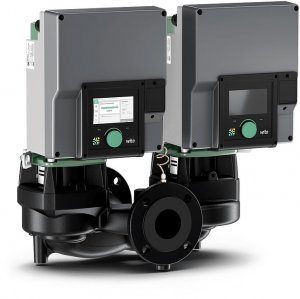 Высокоэффективный сдвоенный линейный насос с электронно-коммутируемым двигателем и электронной мощности с сухим ротором. Исполнение в качестве одноступенчатого низконапорного центробежного консольного насоса с фланцевым подсоединением и скользящим торцовым уплотнением.